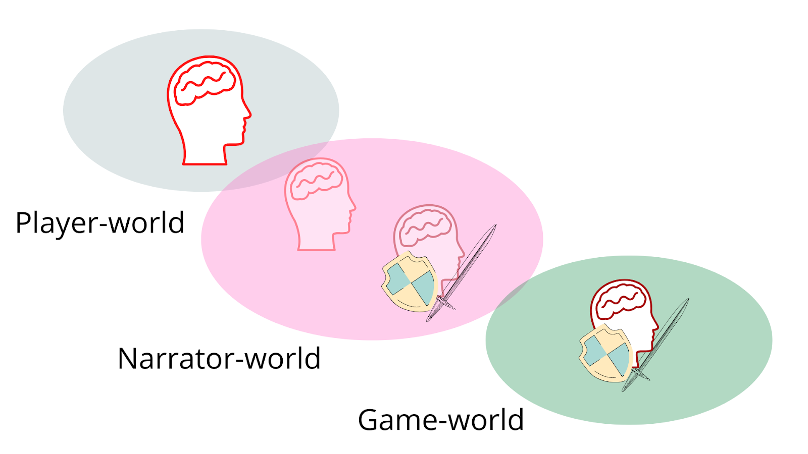 Our first level is the player-world(1): this is the "real" world where the conversation is happening. It includes the three speakers (the three heads in the image above) as well as the implied audience of the YouTube video (the faded person at the bottom).